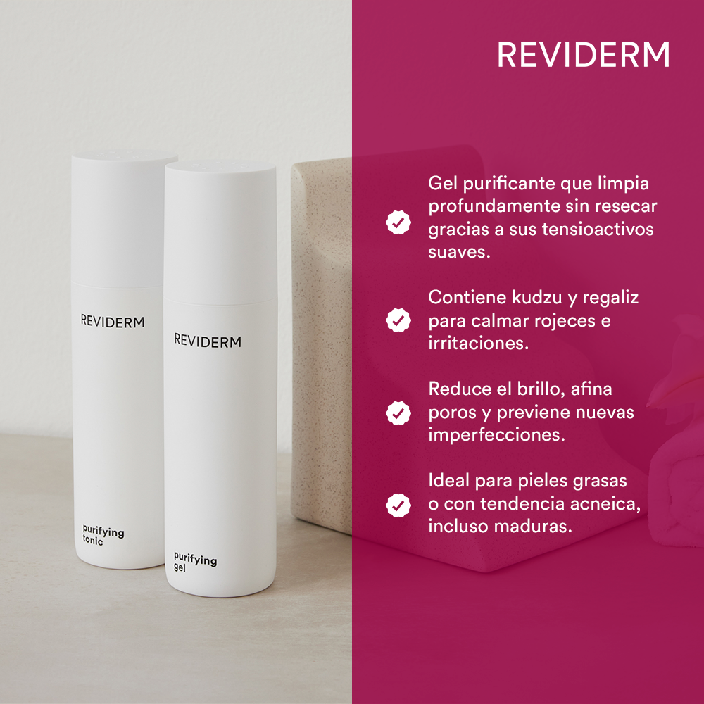 REVIDERM Purifying Gel aplica una tecnología de limpieza seborreguladora inteligente, que combina activos astringentes y calmantes con humectantes biomiméticos. Su fórmula está diseñada para restaurar el equilibrio de la piel grasa sin alterar su función barrera, integrando componentes de alta tolerancia que respetan la fisiología cutánea y optimizan la pureza y textura de la piel.